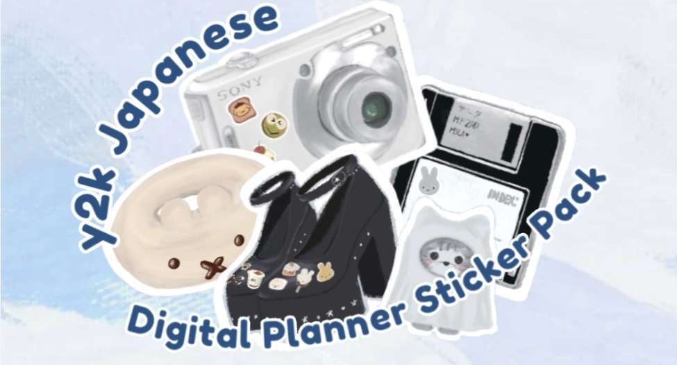 This digital sticker set (PNG files) includes a nostalgic mix of Y2K aesthetics and Japanese charm: a cute camera, stylish shoes, an old computer disk, a ghost cat, and a miffy donut! Perfect for journaling, digital planning, and adding a touch of retro sweetness to your collection.